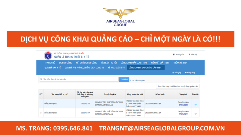 Chào anh chị, kể từ 1/7/2021 công khai nội dung và hình thức quảng cáo là bắt buộc đối với các DN thực hiện quảng cáo TBYT. Do đó, thời gian gần đây có rất nhiều anh chị còn lúng túng về quảng cáo TBYT, dịch vụ công khai quảng cáo TBYT chỉ 1 ngày là có – anh chị liên hệ em Trang 0395.646.841 tư vấn ạ