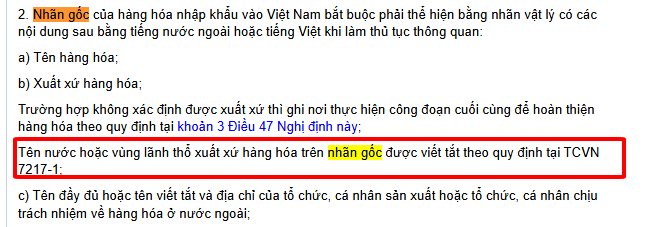 Tên nước hoặc vùng lãnh thổ xuất xứ trên nhãn gốc phải được viết đúng theo quy định tại TCVN 7217-1.